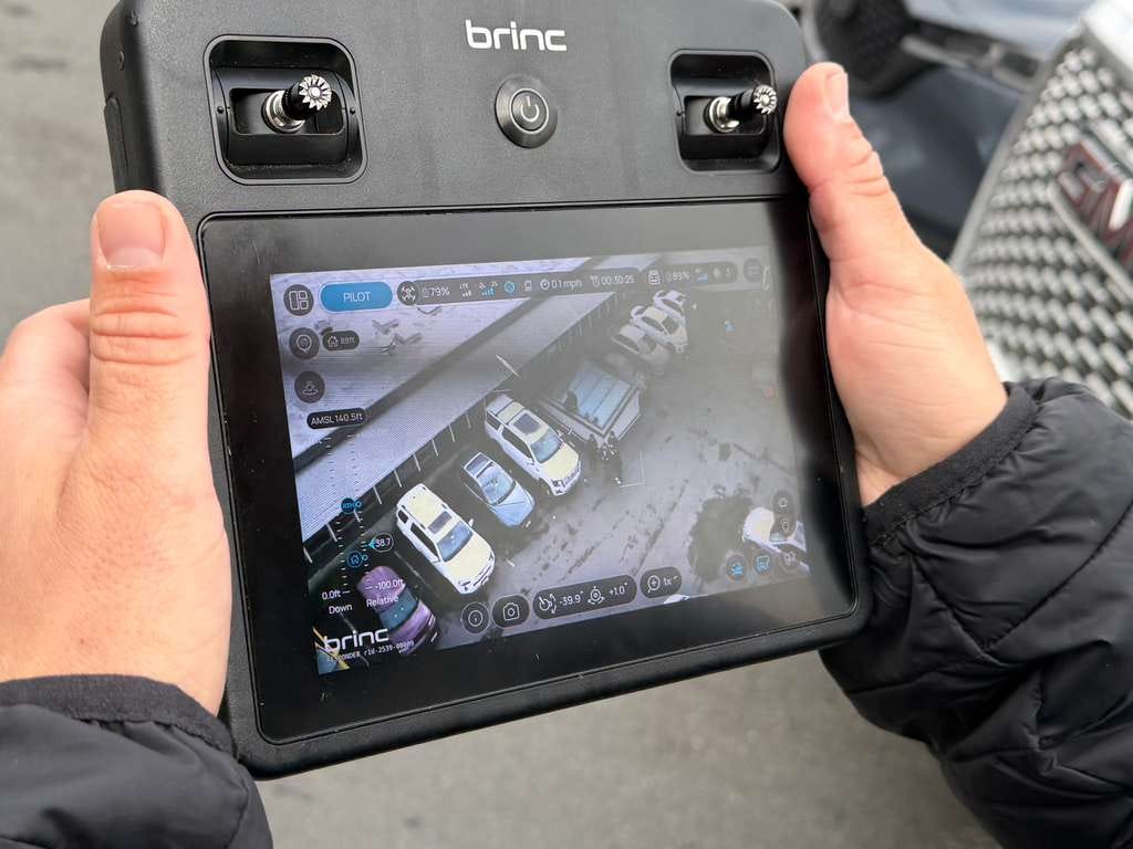 Our drone had a far more important mission on this day: to impress a journalist. Its teleoperator was Dmitry Tarasov, an operations manager at Brinc and one of Resnick’s closest colleagues. He flipped through features as Resnick said them aloud. Show her night vision, now flip on the police lights and sirens. They played a pre-programmed message, alerting the neighborhood about a fictitious missing child. He called the drone to demonstrate its two-way communication capability. “One, two, three, four, five,” Resnick’s voice boomed through the drone.