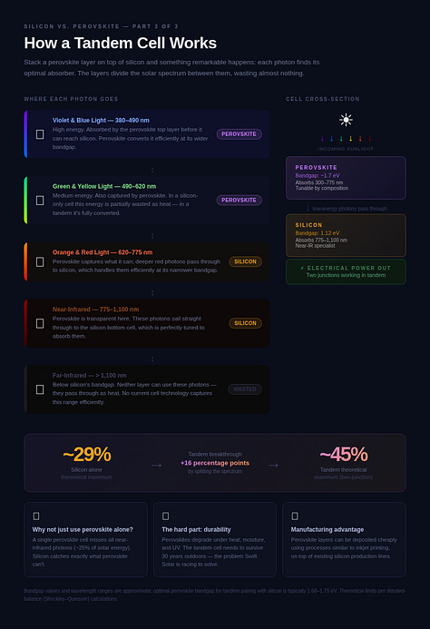 Swift plans to enter the more traditional solar market quickly by building a cell and panel factory based on the Meyer Burger technology in the U.S. It will then look to add its perovskite equipment to the same production line and create cells that blend perovskite and silicon. If all goes smoothly, the combo cells pumped out by the factory would have much higher efficiency than current silicon-only cells. (Current solar cells have approached a limit of 30 percent efficiency, while the so-called tandem cells could hit 45 percent efficiency.)